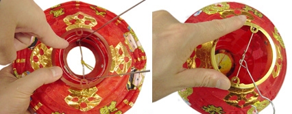 3. ランタンの縁を持ち、上面の穴にあわせ金具の凸を入れます