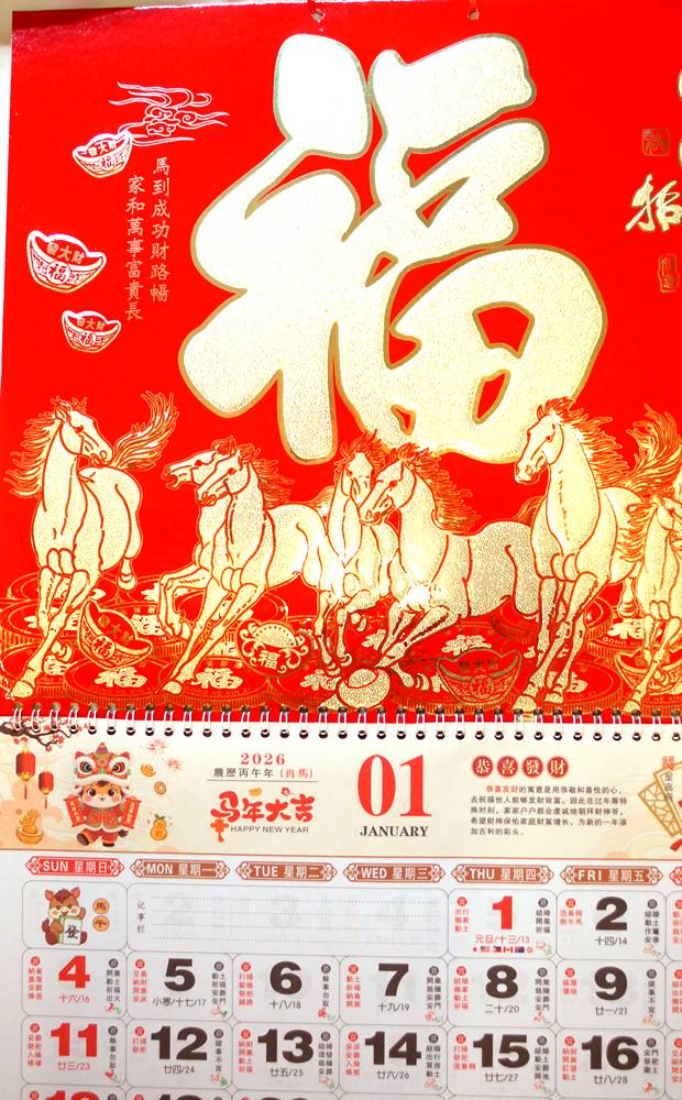 「福」文字と「駿馬招財」 が描かれた壁掛けカレンダー