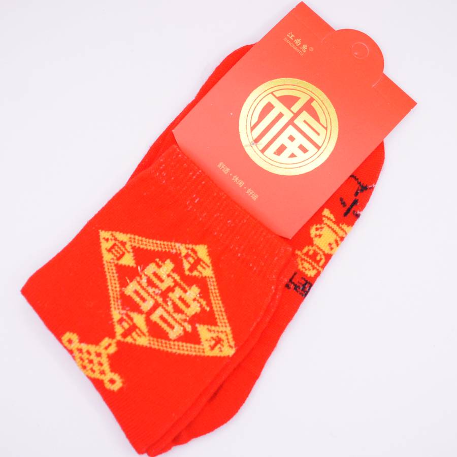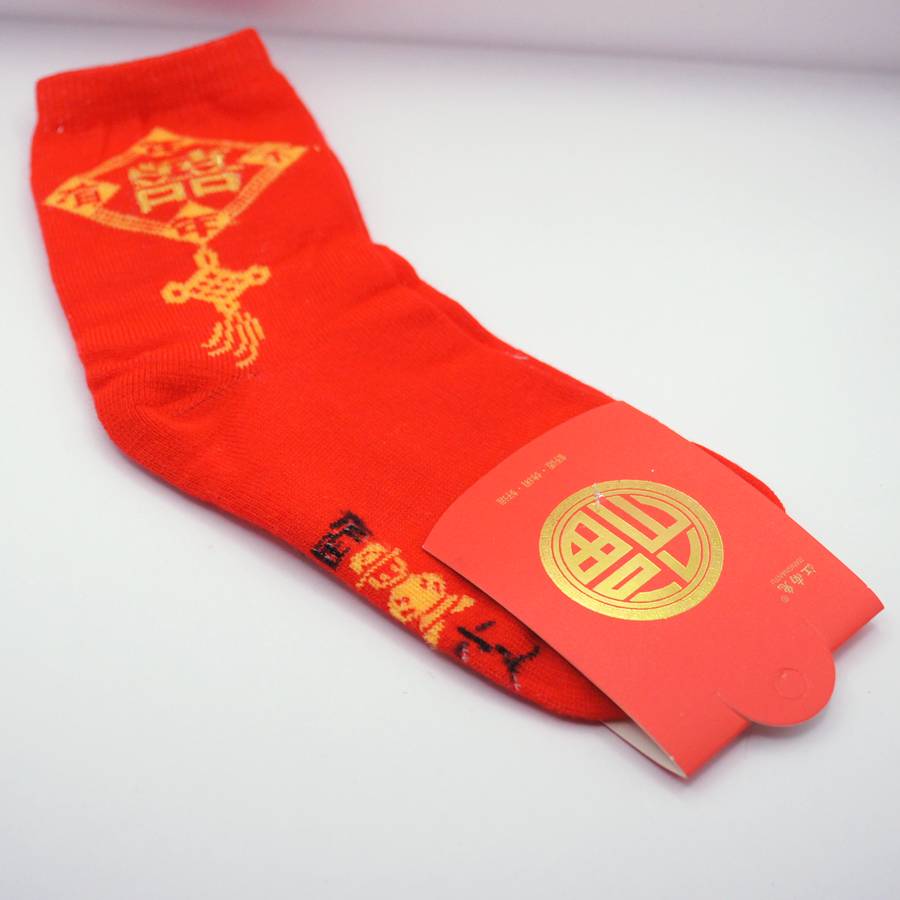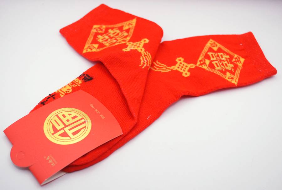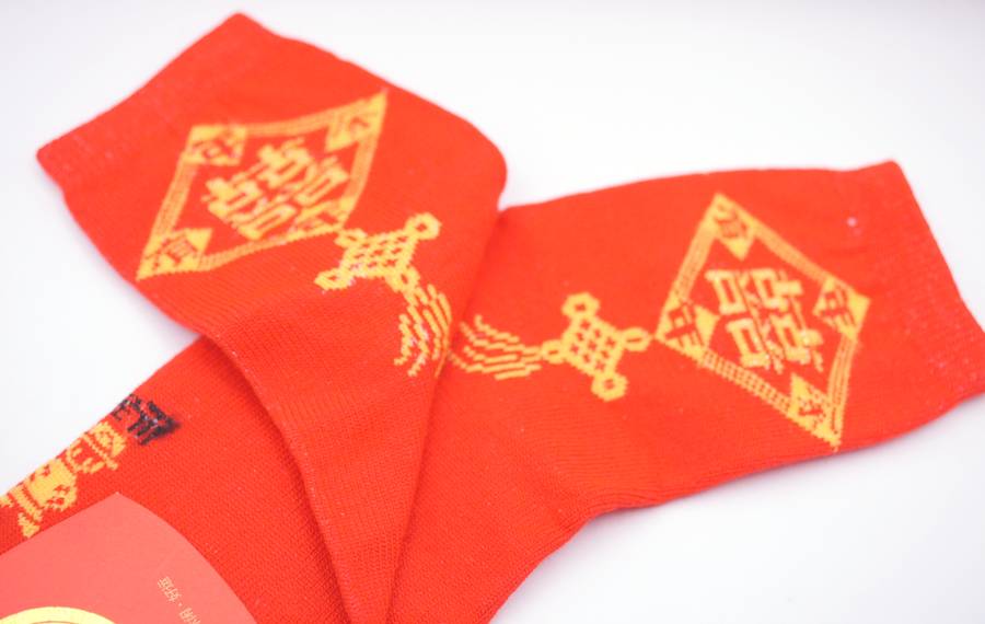 中国で縁起のいい文字は「双喜」であり、人生に幸福を招く吉祥のデザインとして多くの飾りに利用されており、その文字を大きくワンポイントであしらったソックスです。
