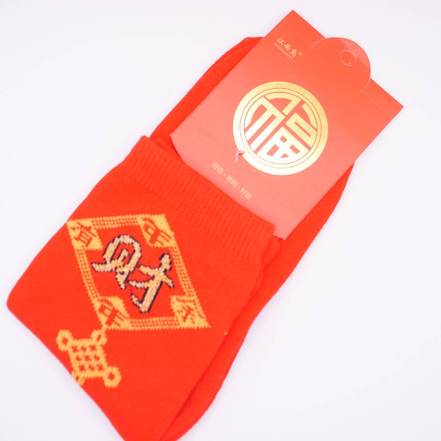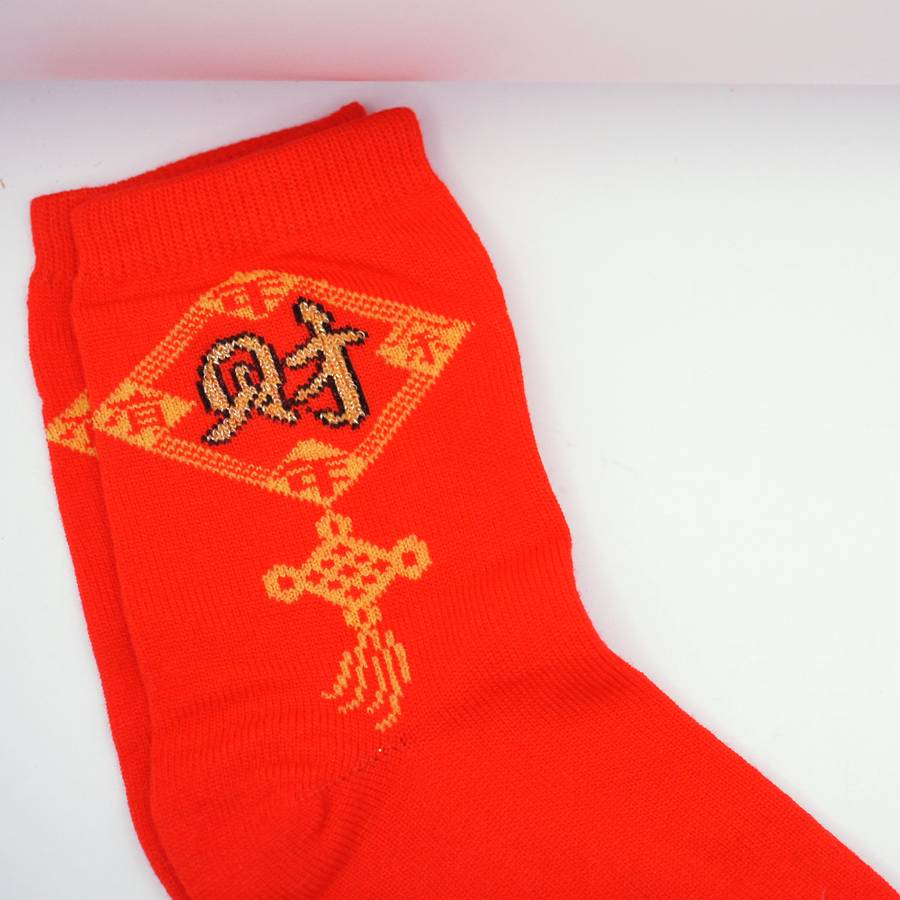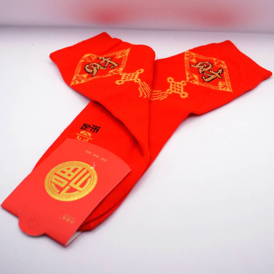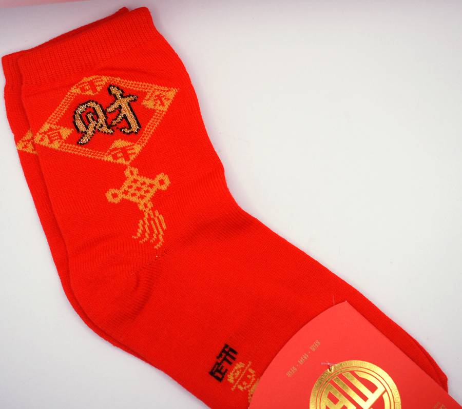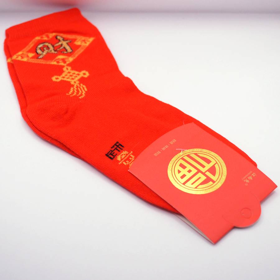 中国で縁起のいい文字は「財」であり、人生に幸福を招く吉祥のデザインとして多くの飾りに利用されており、その文字を大きくワンポイントであしらったソックスです。