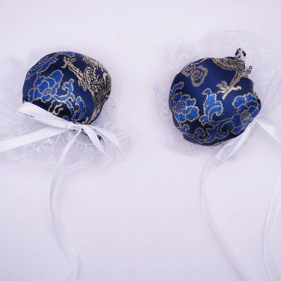 チャイナドレスを作るときにでる端布を使用した、可愛いお団子髪飾りです。縁にはレースをあしらい、リボンをたらしました。チャイナドレスに合わせるとポイントUP間違い無しです。